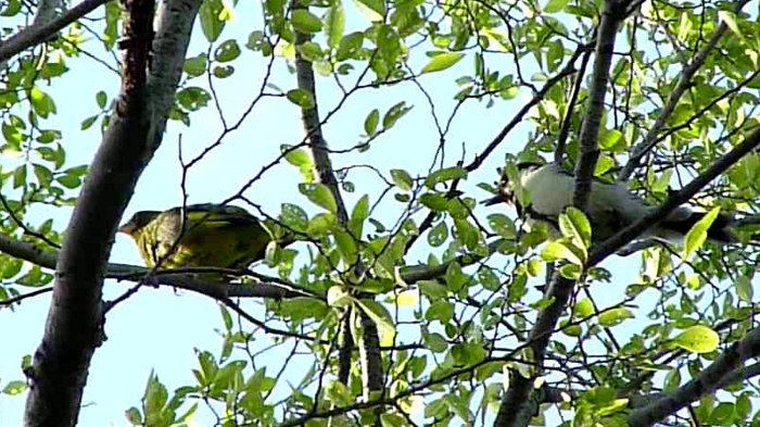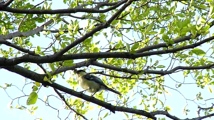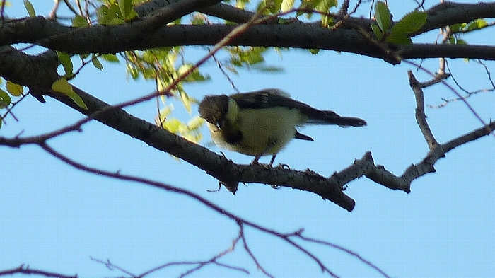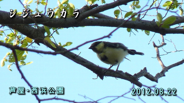 雲一つない青空からじりじりと照りつける光が眩しい。頭上からシジュウカラのか細い鳴き声がきっ超えてきました。数羽が枝から枝へ飛び交っていました。中にカワラヒワの混じっています。